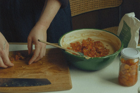 Watch Xanthe demonstrate the recipe in full on our IGTV channel. Xanthe wears our Linen Workwear Apron and uses the Leach Pottery Preparation Bowls, Ambrose Vevers Scorched Ash Chopping Board and Lucy Rutter Bottle Vase.