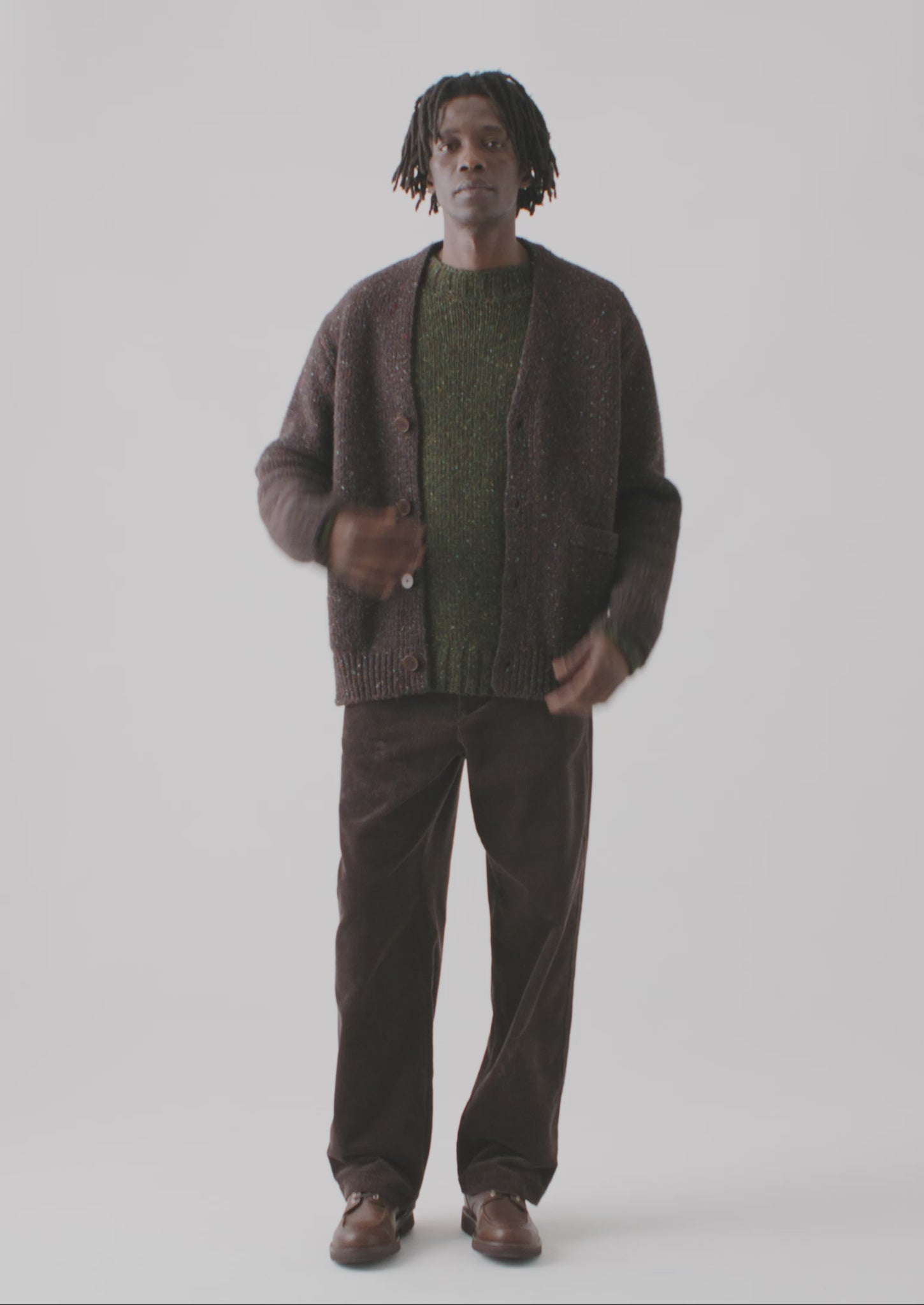 Our cardigan is knitted from weighty, flecky wool which is spun in Donegal, Ireland. With a relaxed V-neck shape accented by side patch pockets. Part of our Menswear collection.