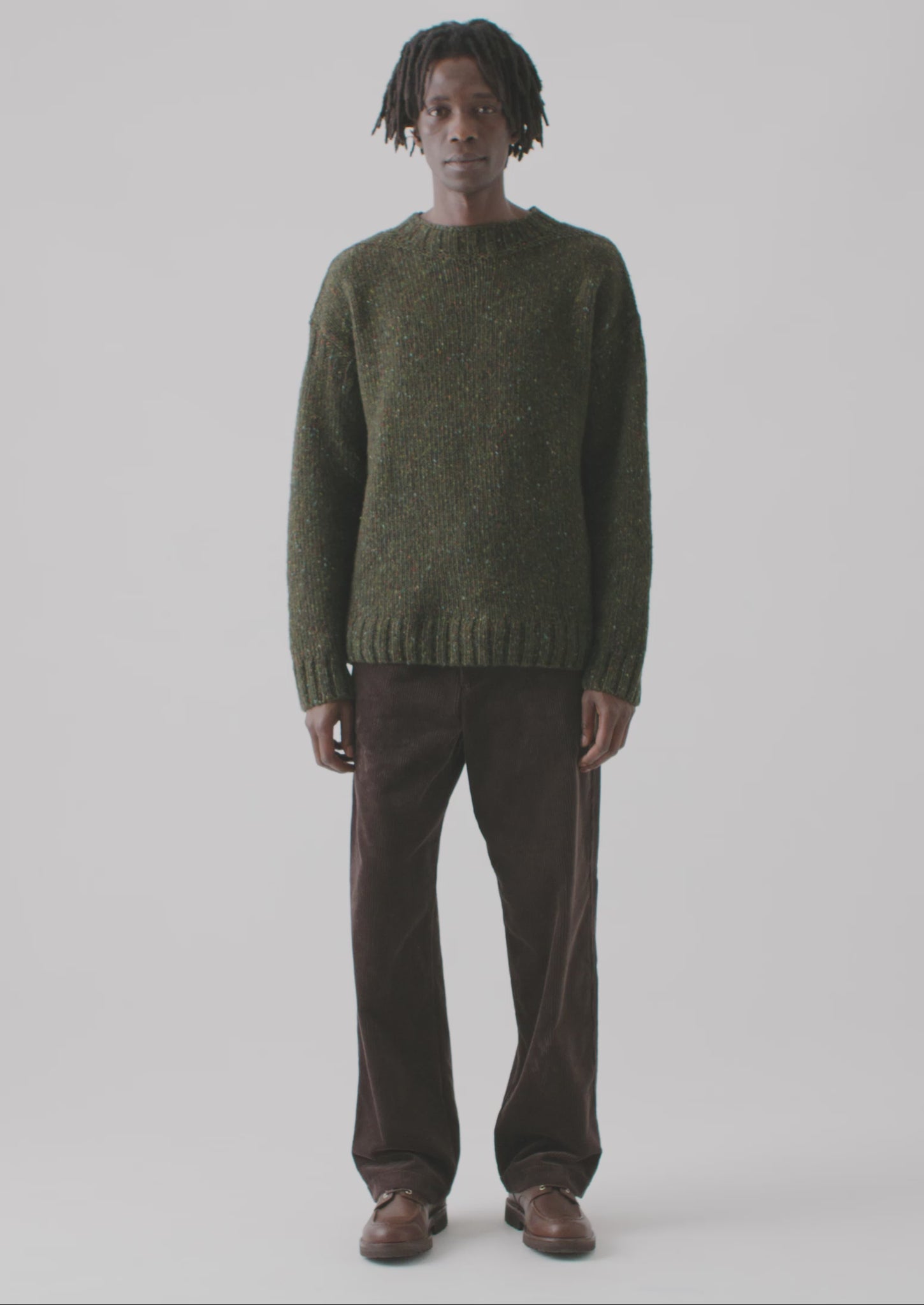 Our jumper is made using a flecky wool yarn spun in Donegal. A relaxed shape with dropped shoulders and a high neckline. Finished with ribbed trims. Part of our Menswear collection.
