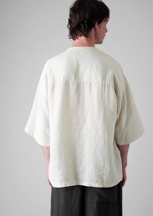 Garment-dyed linen. Grandad collar. Loose fit. Patch pockets. Short sleeves.