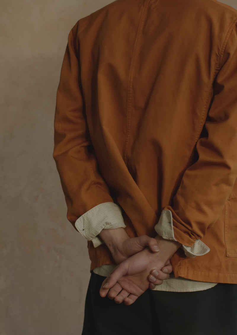 Striped organic cotton poplin. Grandad collar. Back yoke panel. Small back pleats. Chest patch pocket. Buttoned cuffs. Curved hem. Half placket. Corozo buttons.