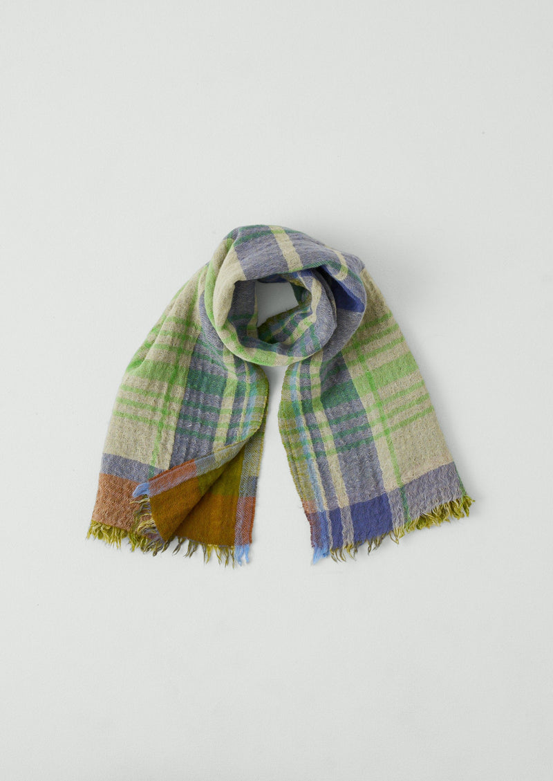 Double-faced boiled wool scarf featuring a large checked pattern, hand-woven by artisans in India and finished with fringed ends.