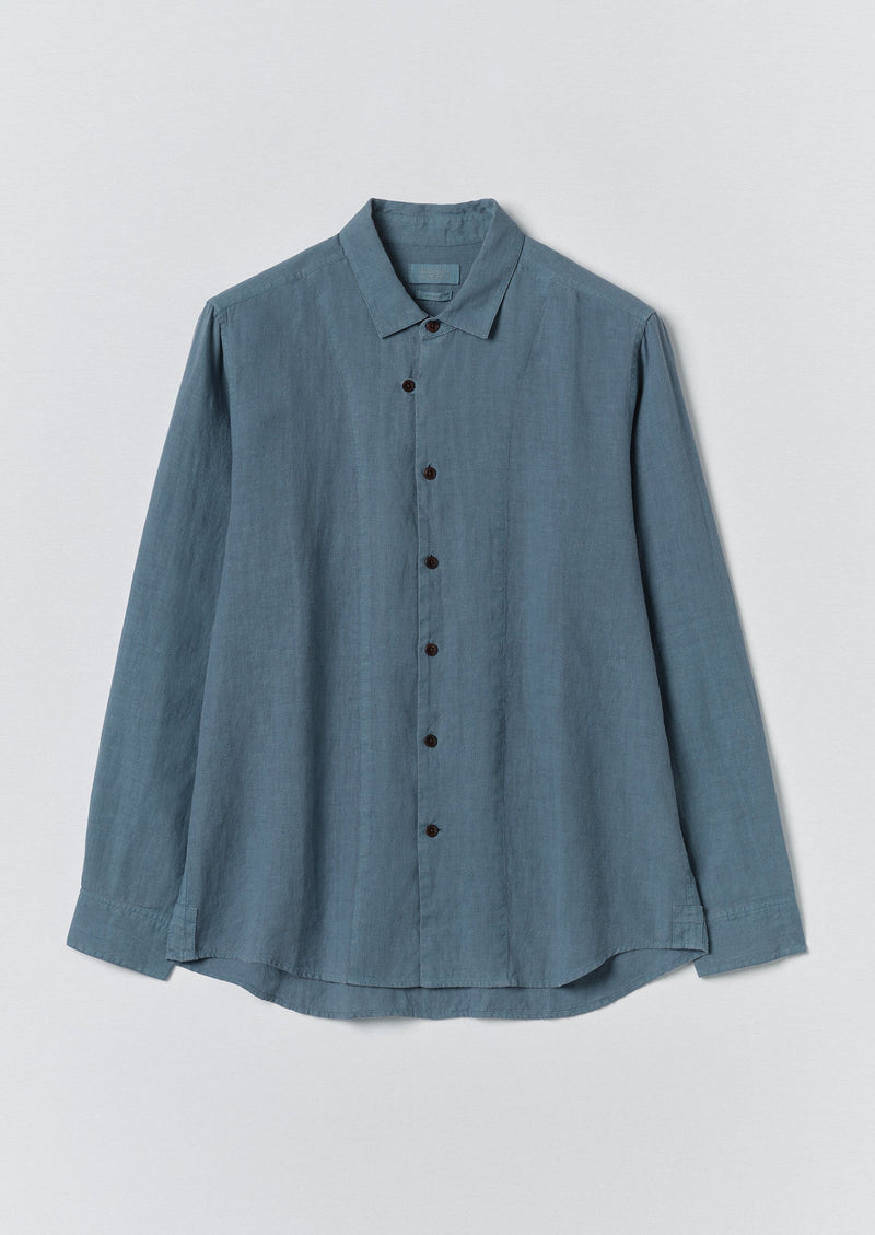 Linen. Garment-dyed. Small point collar. Forward-sitting shoulder seams. Curved hem. Asymmetric loop.