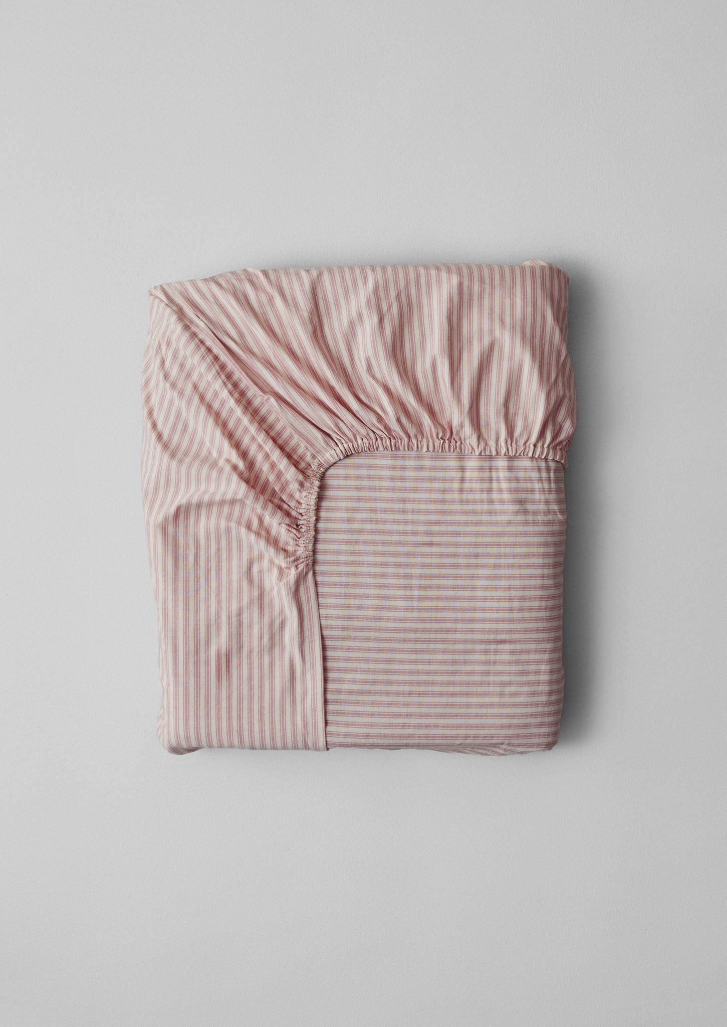 Traditional woven ticking stripe bed linen in soft, weighty, organic cotton. Two rows of satin stitch along the edge of the sheet.