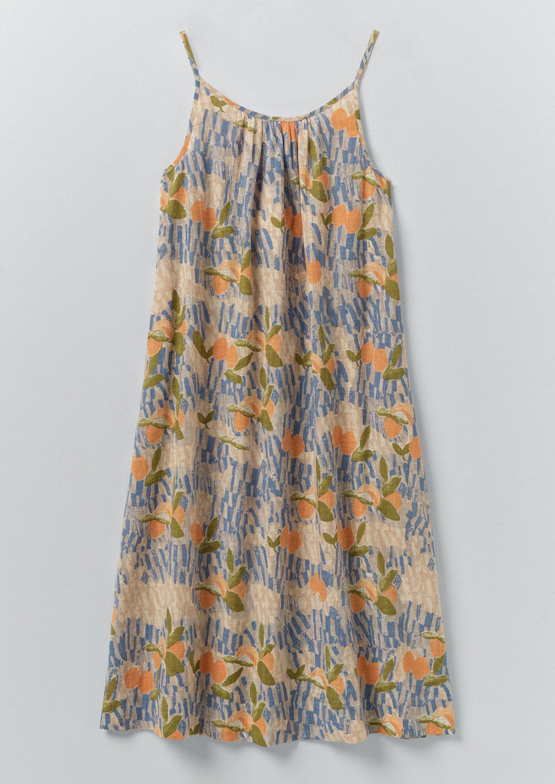 Printed organic crosshatch cotton. Easy fit. Gathered round neck and scoop back. Side seam pockets. Side hem slits. Upper-calf length.