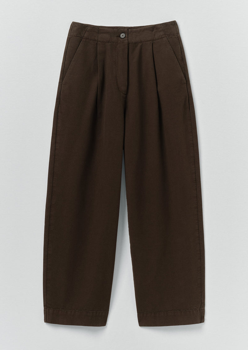 Front pleats give subtle volume to our trousers, which are made from organic cotton canvas, then garment-dyed for a rich depth of colour. The relaxed rise creates an easy, laid-back silhouette with cropped legs. Finished with slant front pockets and back welt pockets.