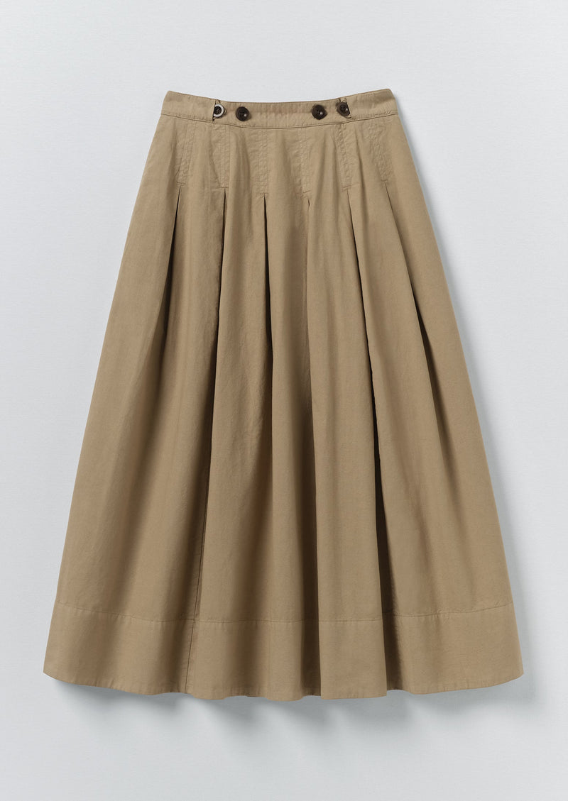 Inverted box pleats bring movement to our poplin skirt, which is garment-dyed for a rich depth of colour. Made from a blend of organic cotton and linen with a back elasticated waist and front adjustable tabs securing with corozo buttons.