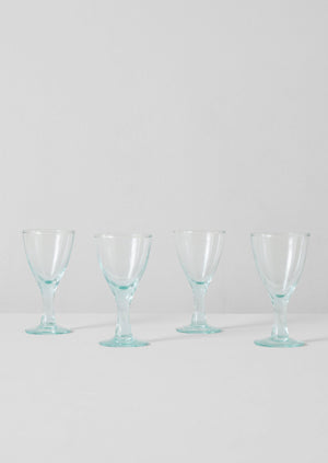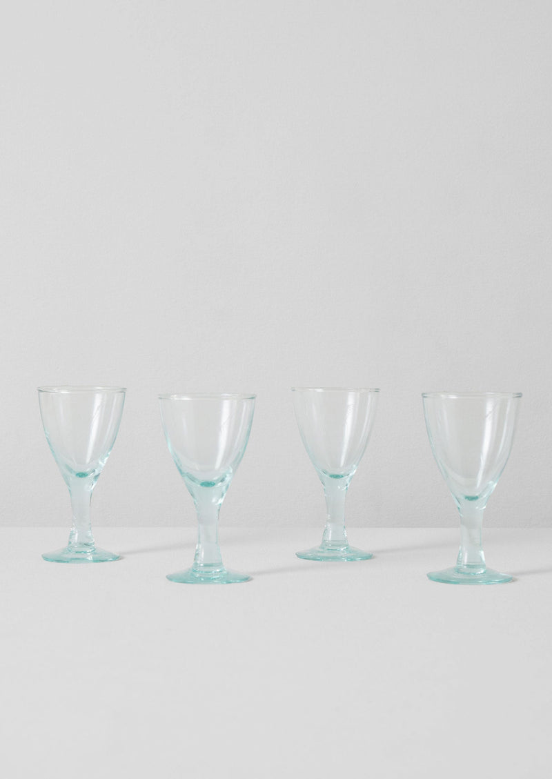 A set of four wine glasses made from 100% recycled glass. Crafted in a glass-making factory situated in Cochabamba, central Bolivia. May feature slight warps, marks and air bubbles, which are traces of the artisanal process.
