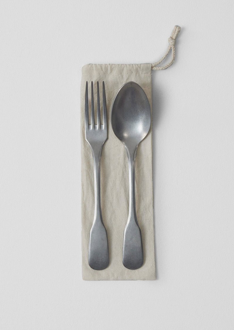 Weighty fork and spoon set, for serving. Crafted in Italy from stainless steel with a stonewashed finish. Accompanied by a cotton drawstring bag.