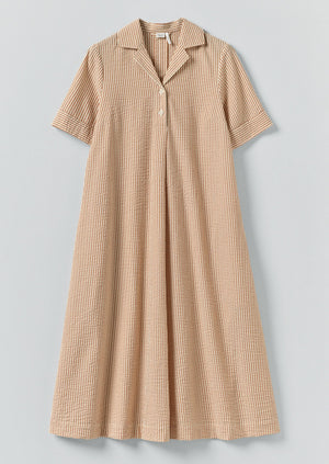 Our relaxed dress is made from a striped cotton seersucker. Shaped with a camp collar and half placket, side slip pockets maintain an easy silhouette. Fastened with corozo buttons.